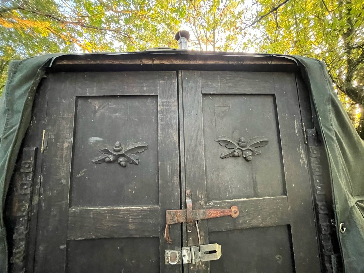-3 wall sections, 36 roof roles, one wheel, coppiced door frame, with a high ceiling for a yurt.-oak 2 part opening front door