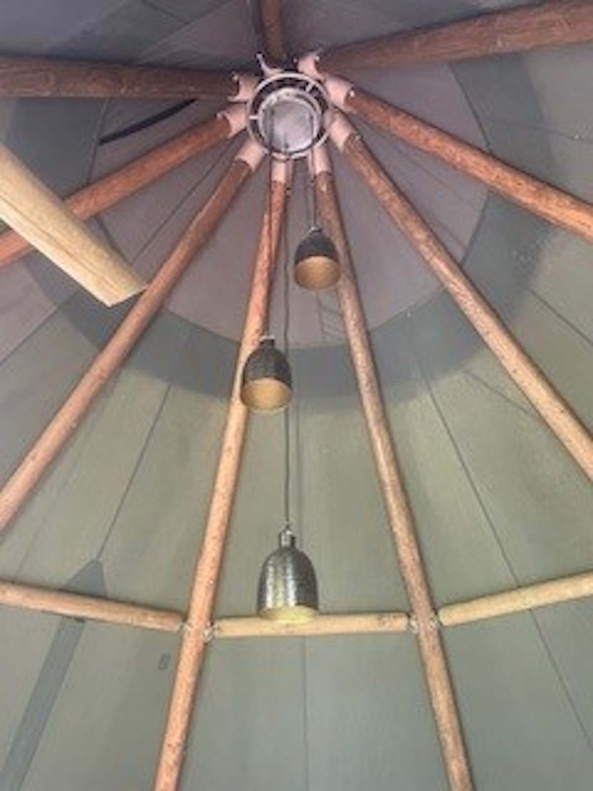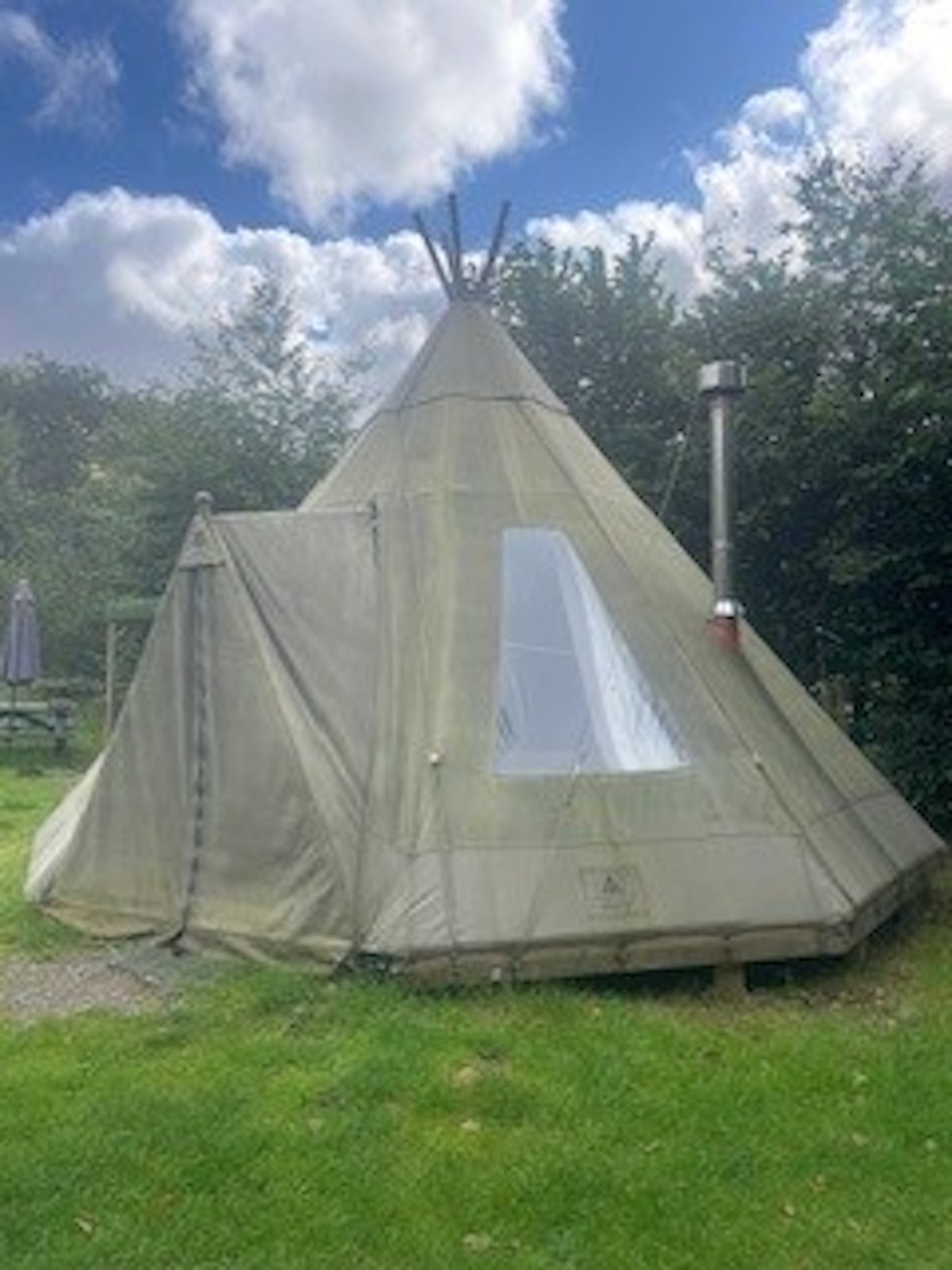 The Tipi Company Baby tipi 6.5 metres used.Used commercially from 2020, seals and canvas still water proof would benefit from clean and reproof. No tears or repairs. Stoves and flues included, stoves require repair / refresh or replace. Full wooden bases included.