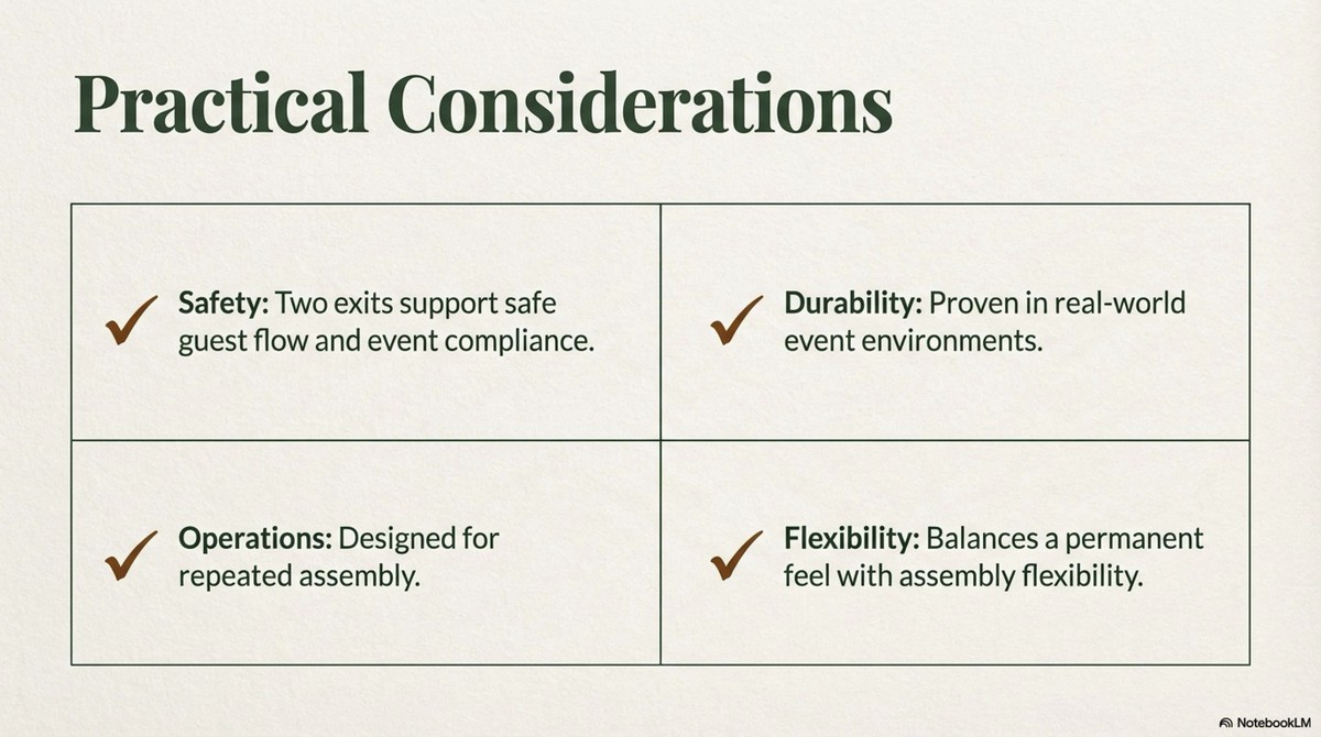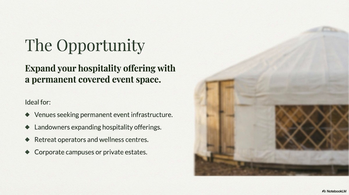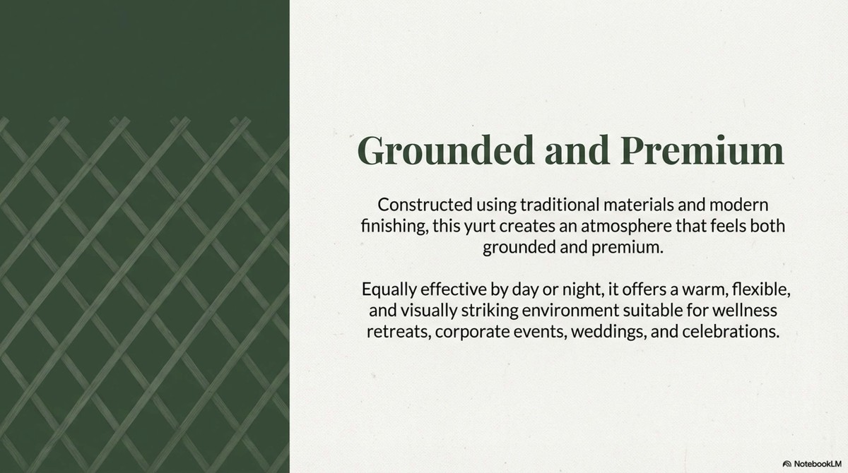 Equally effective by day or night, it offers a warm, flexible, and visually striking environment suitable for wellness retreats, corporate events, weddings, and celebrations.