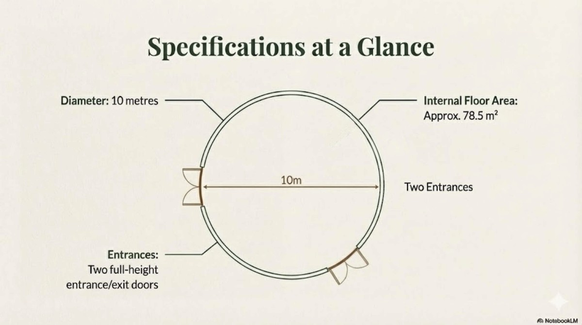The circular design naturally supports group-based experiences and connection, making it an ideal focal point for a retreat centre.