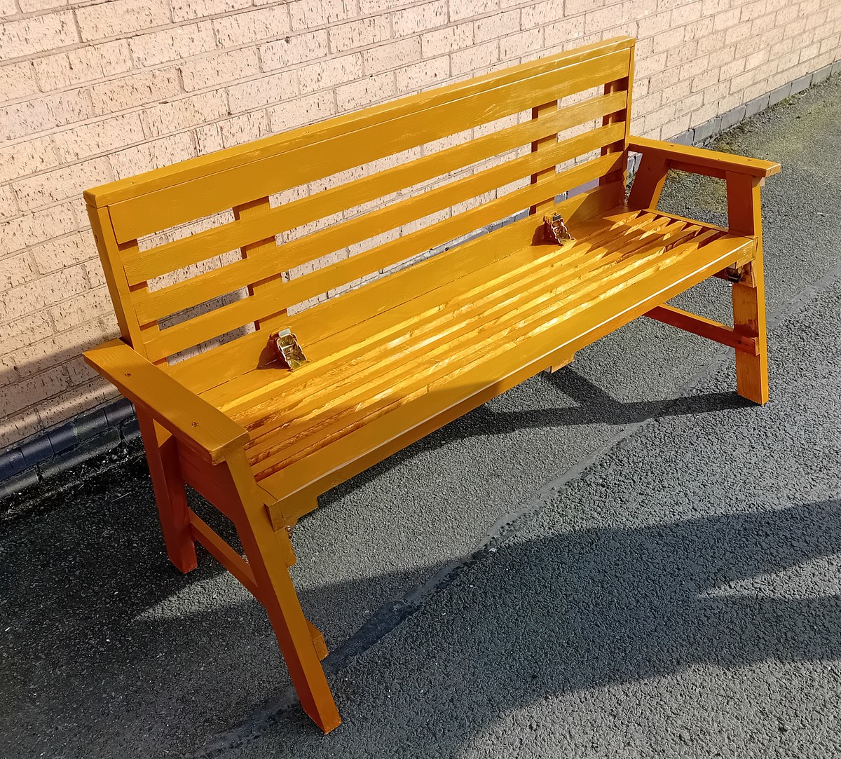 Park bench, seats 3.Unique fold down for space saving storage, easy transportation.
